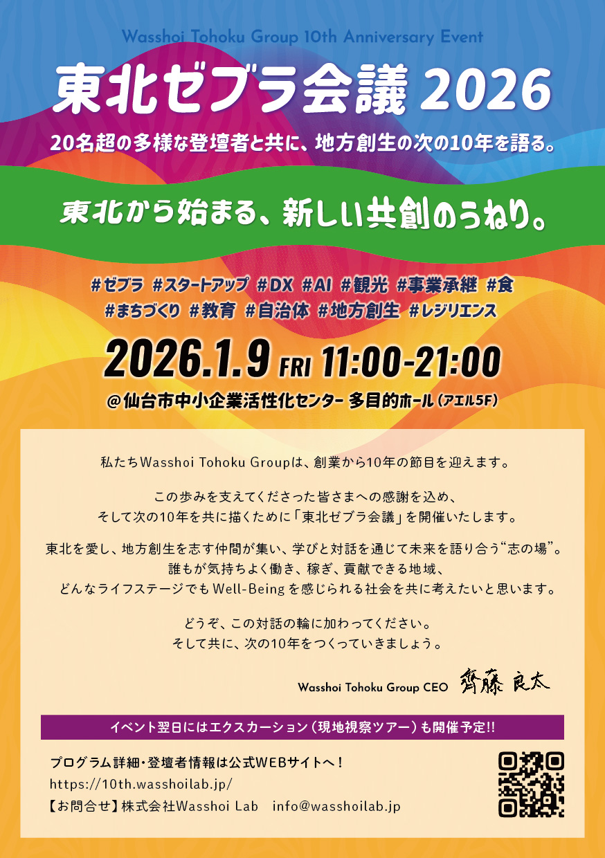 Wasshoi Tohoku Group(株式会社Wasshoi Lab 代表取締役:齊藤良太)は、ゼブラ企業(利益と社会性の両立を志向する企業)の実践者が集うカンファレンス「東北ゼブラ会議2026」を開催いたします。
